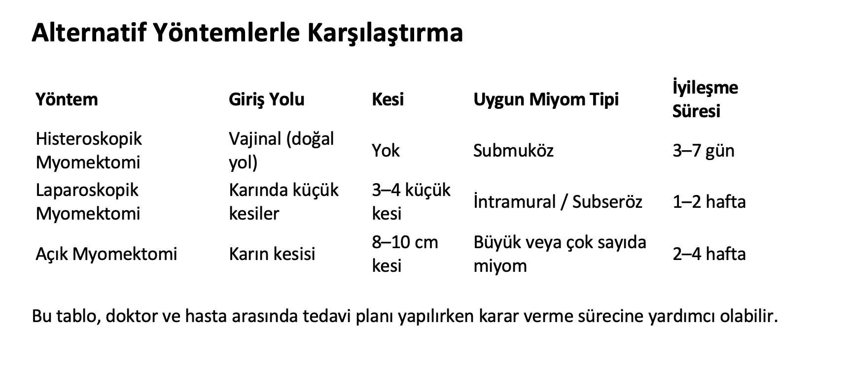 Ancak rahim duvarının dış kısmına doğru büyüyen (subseröz) veya kas tabakası içinde (intramural) bulunan miyomlarda bu yöntem uygulanamaz. Bu durumda laparoskopik (kapalı karın cerrahisi) ya da açık cerrahi (laparotomi) seçenekleri değerlendirilir.